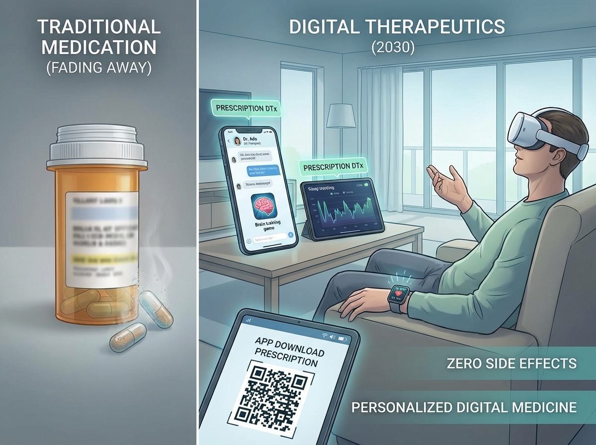 2030년의 약국에서는 화학 성분으로 만든 알약뿐만 아니라, 스마트폰에 다운로드하는 ‘소프트웨어’를 처방받게 됩니다. 이를 디지털 치료제(Digital Therapeutics, DTx)라고 부릅니다.